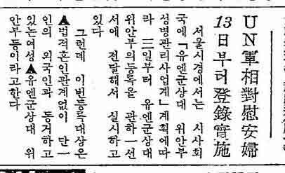 ソウル市警では市社会局に「国連軍相手慰安婦性病管理士業界」計画によって三日から国連軍相手慰安婦の登録を官下一線署に伝達して実施している。 ところで今度の登録対象は▲法的婚姻関係がなくただ一人の外国人と同居している女性▲国連軍相手慰安婦などだと言う。 |