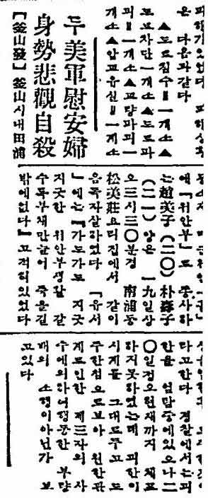 20歳と21歳の米軍慰安婦2人が自らの身の上を悲観して自殺。 |
