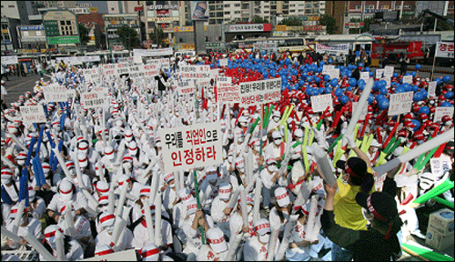 売春女性3000人余が19日、ソウル・清涼里(チョンリャンリ)駅広場で性売買特別法による取り締まりの中止と公娼制度の施行などを要求する集会を開いている。 (太字:管理人) |